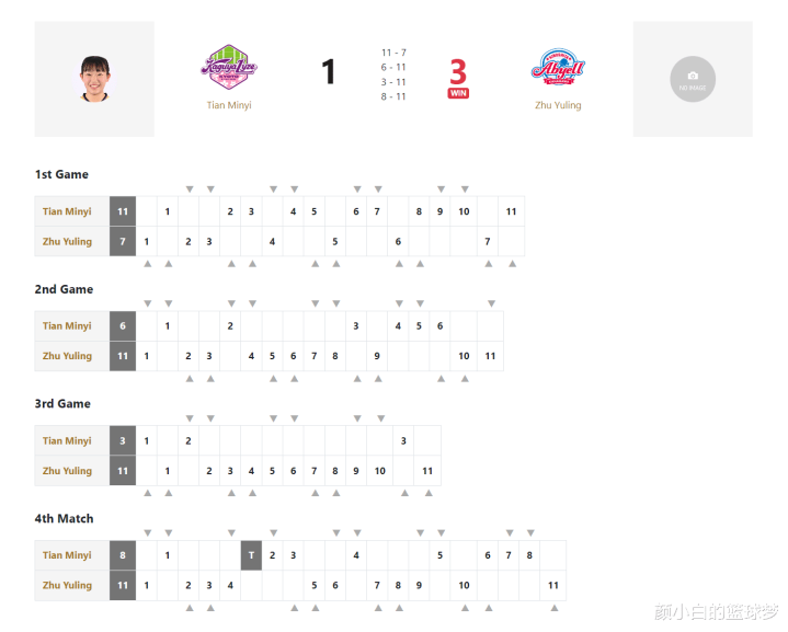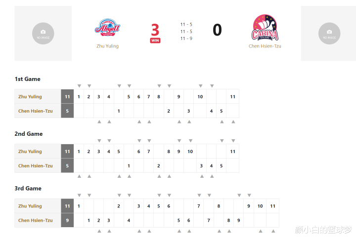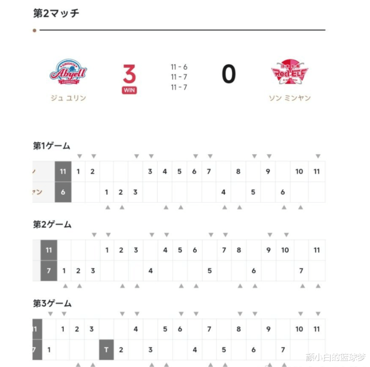 上一场木下神奈川的对手是九州,那场比赛朱雨玲的对手是郑先知,最终也是3-0拿下胜利,三局比分11-5、11-5、11-9。第一局是10-3拿局点,第二局是10-2拿局点,只有第三局稍微胶着一点,两人打到9-9。