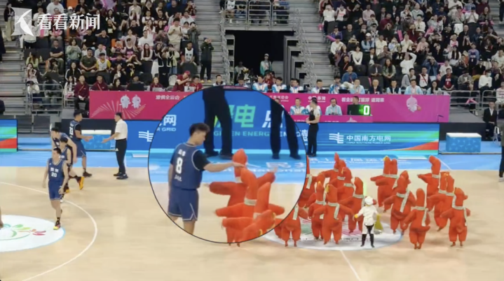 11月12日,在广东省东莞市举行的第十五届全国运动会篮球男子成年组决赛现场,小朋友们带来节目《莞小鹅》萌翻全场。广东队球员赵睿忍不住伸手摸“烧鹅仔”的头,随后露出“姨母笑”。
